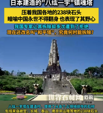 石材網報道:在日本宮崎縣和平臺公園的綠茵深處,一座36.4米高的石塔靜靜矗立。日方為其披上“和平之塔”的溫情外衣,常年迎來送往各地游客,試圖將其打造成承載祈愿的地標。然而,這座石塔的每一塊石材都在無聲嘶吼——它原名“八纮一宇塔”,并非和平的圖騰,而是二戰時期日本軍國主義侵略野心的物質載體,372塊塔石中,238塊源自中國(含臺灣地區40塊),123塊取自朝鮮半島,其余則劫掠自庫頁島、新加坡、菲律賓、秘魯等十余處被侵略或滲透之地。更具諷刺意味的是,塔身核心采用日本皇室發源地宮崎的石材構筑,形成“侵略者居上、被征服者為基”的暗黑格局,將“稱霸寰宇”的妄想永久澆筑進建筑肌理,成為一座無法抹去的侵略“恥辱碑”。