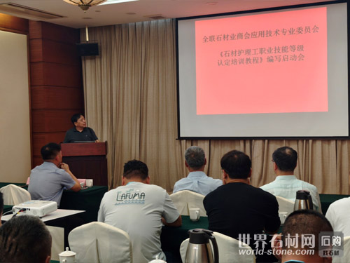 人力資源和社會保障部職業技能鑒定中心標準教材處處長陸照亮、全聯石材業商會秘書長陳雪根、中國建筑材料工業規劃研究院石材產業研究院前院長蘇桂軍、教授級高工李正榮等領導專家出席會議。全聯石材業商會應用技術專業委員會主任王建秋、名譽主任王延華及丁錦平、謝登祥、張中年、相博超等委員,以及參與“石材護理工職業培訓”的全體學員共同參加了會議。